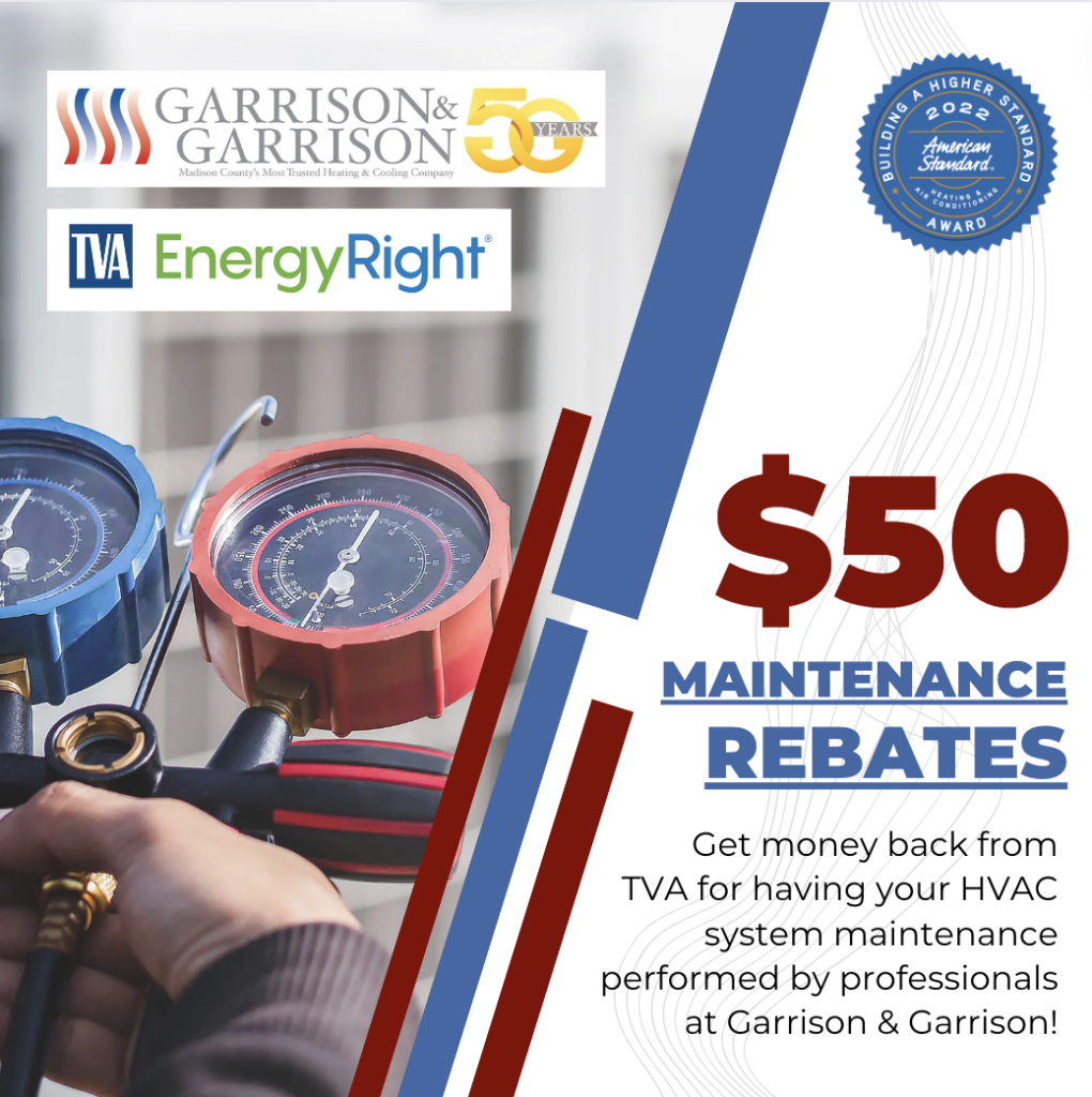 TVA Energy Right is offering a $50 rebate (per system) for their customers who have maintenance performed on their HVAC unit(s). As a certified contractor for TVA Energy Right, Garrison and Garrison can offer you the benefits of having your HVAC system maintained and provide you with the information you need to file for your rebate. *The $50 rebate comes from TVA, and not Garrison and Garrison. Want to know more? Give us a call!